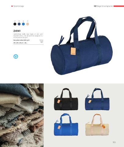 Sports bags 02 Bags & backpacks 02 05 10 22 24141 Sports/travel duffle bag made of 280 g/m² recycled cotton. • Sac de sport/de voyage en co- ton recyclé de 280 g/m². Recycled cotton 280 g/m² 10/50 45 x 25 x 25 cm - 28 L 163