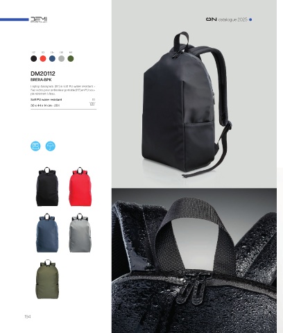 catalogue 2025 02 03 05 08 64 DM20112 BRERA•BPK Laptop backpack (15”) in soft PU water resistant. • Sac à dos pour ordinateur portable (15”) en PU sou- ple résistant à l’eau. Soft PU water resistant 10 30 x 44 x 14 cm - 20 l 194