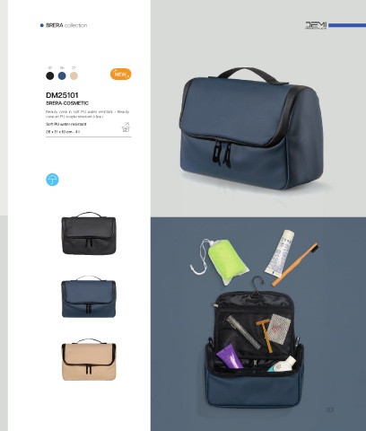 BRERA collection 02 05 22 NEW DM25101 BRERA•COSMETIC Beauty case in soft PU water resistant. • Beauty case en PU souple résistant à l’eau. Soft PU water resistant 25 26 x 17 x 10 cm - 4 l 201
