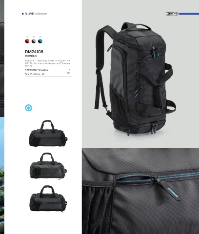R•LIVE collection 03 08 15 DM24106 ROMOLO Backpack / duffel bag made of recycled PET (R-PET). • Sac à dos / sac de sport en PET recyclé (R-PET). R-PET 900D, PU coating 8 62 x 26 x 26 cm - 42 l 215