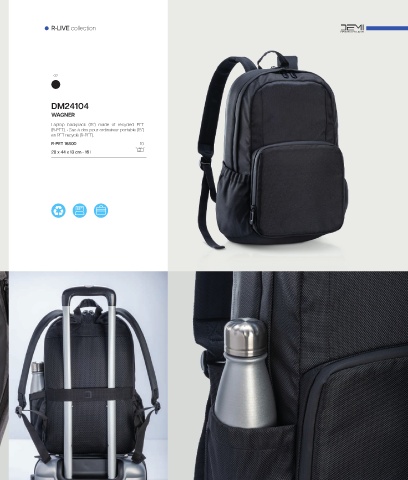 R•LIVE collection 02 DM24104 WAGNER Laptop backpack (15”) made of recycled PET (R-PET). • Sac à dos pour ordinateur portable (15”) en PET recyclé (R-PET). R-PET 1680D 10 28 x 44 x 13 cm - 16 l 217