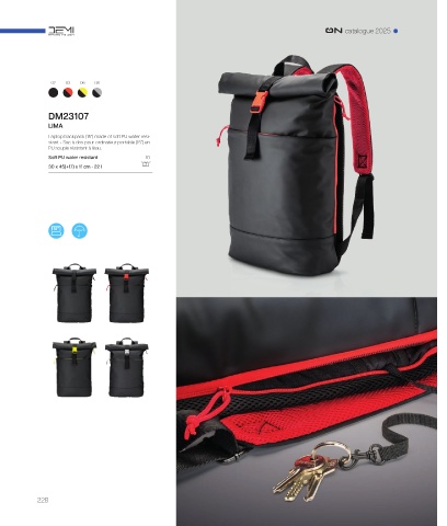 catalogue 2025 02 03 06 08 DM23107 LIMA Laptop backpack (15”) made of soft PU water resi- stant. • Sac à dos pour ordinateur portable (15”) en PU souple résistant à l’eau. Soft PU water resistant 10 30 x 45(+17) x 11 cm - 22 l 228
