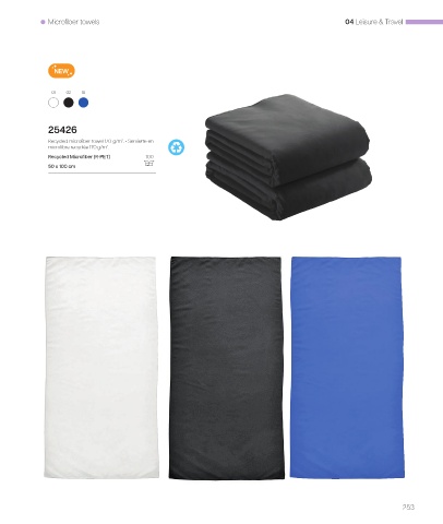 Microfiber towels 04 Leisure & Travel NEW 01 02 10 25426 Recycled microfiber towel 170 g/m². • Serviette en microfibre recyclée 170 g/m². Recycled Microfiber (R-PET) 100 50 x 100 cm 253