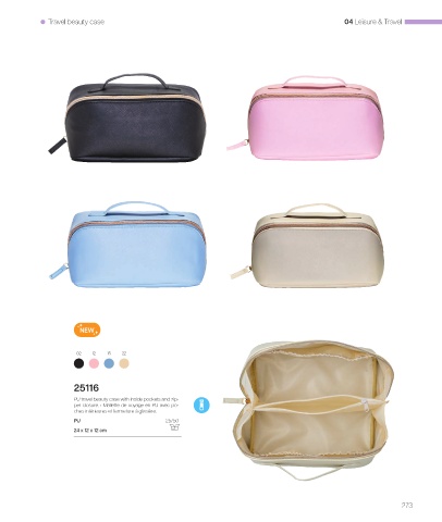 Travel beauty case 04 Leisure & Travel NEW 02 12 15 22 25116 PU travel beauty case with inside pockets and zip- per closure. • Mallette de voyage en PU avec po- ches intérieures et fermeture à glissière. PU 25/50 24 x 12 x 12 cm 273