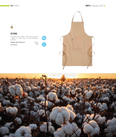 06 Kitchen catalogue 2025 22 21416 2 Long 200 g/m organic cotton kitchen apron. • Tablier de cuisine long en coton biologique 200 g/m². Organic cotton 200 g/m 2 10/100 200 60 x 90 cm gm 2 330