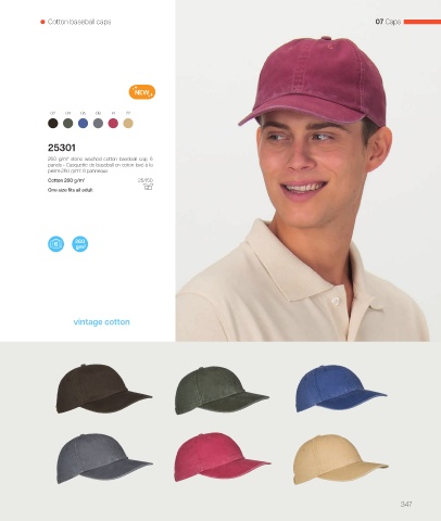 Cotton baseball caps 07 Caps NEW 02 04 05 08 14 22 25301 260 g/m² stone washed cotton baseball cap, 6 panels • Casquette de baseball en coton lavé à la pierre 260 g/m², 6 panneaux Cotton 260 g/m² 25/150 One size fits all adult vintage cotton 347