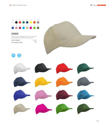 Cotton baseball caps 07 Caps 01 02 03 04 05 06 07 08 10 12 14 15 22 27 44 64 00615 160 g/m² cotton baseball cap, 5 panels • Casquette de baseball en coton 160 g/m², 5 panneaux Cotton 160 g/m² 50/200 One size fits all adult 351