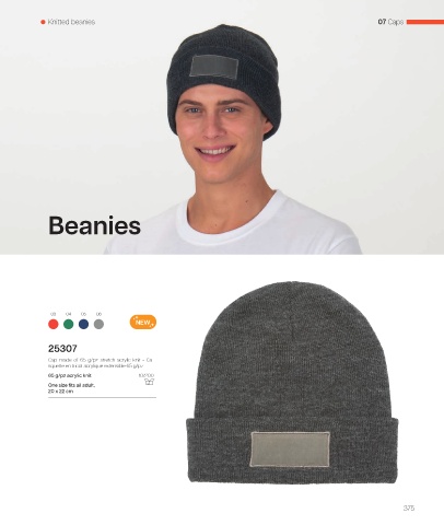 Knitted beanies 07 Caps Beanies 03 04 05 08 NEW 25307 Cap made of 65 g/pz stretch acrylic knit • Ca- squette en tricot acrylique extensible 65 g/pz 65 g/pz acrylic knit 10/200 One size fits all adult, 20 x 22 cm 375