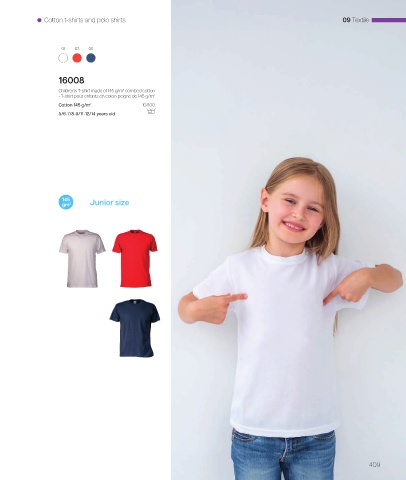 Cotton t-shirts and polo shirts 09 Textile 01 03 05 16008 Children’s T-shirt made of 145 g/m² combed cotton • T-shirt pour enfants en coton peigné de 145 g/m² Cotton 145 g/m² 10/100 5/6-7/8-9/11-12/14 years old Junior size 409
