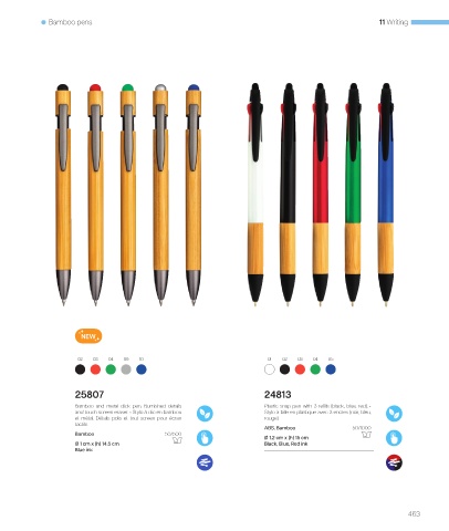 Bamboo and metal click pen. Burnished details Plastic snap pen with 3 refills (black, blue, red). •