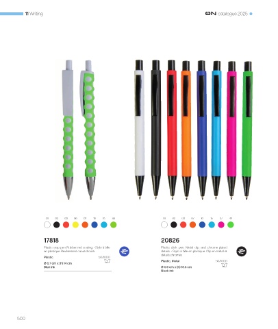 Plastic snap pen. Rubberized coating. • Stylo à bille Plastic click pen. Metal clip and chrome-plated