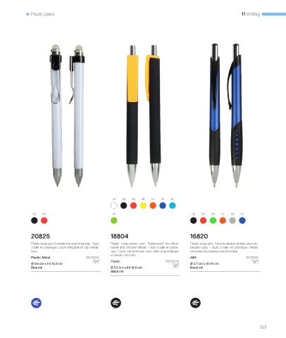 Plastic snap pen. Erasable ink and metal clip. • Stylo Plastic snap-action pen. Rubberized tire-effect Plastic snap pen. Chrome-plated details and rub-