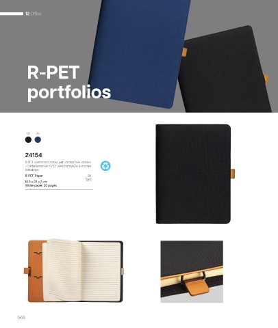 12 Office R-PET portfolios 02 05 24154 R-PET conference folder with metal hook closure • Conférencier en R-PET avec fermeture à crochet métallique R-PET, Paper 20 16.5 x 22 x 2 cm White paper, 20 pages 568