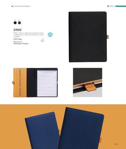 Conference folders 12 Office 02 05 24153 R-PET conference folder with metal hook closure • Conférencier en R-PET avec fermeture à crochet métallique R-PET, Paper 20 23.5 x 31 x 1.5 White paper, 20 pages 569