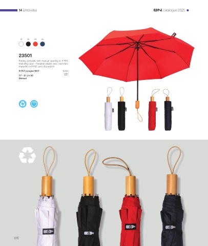 14 Umbrellas catalogue 2025 01 02 03 05 23501 Folding umbrella with manual opening in R-PET, matching case • Parapluie pliable avec ouverture manuelle en R-PET, avec étui assorti R-PET pongee 190T 12/60 21” - Ø cm 98 Manual 616