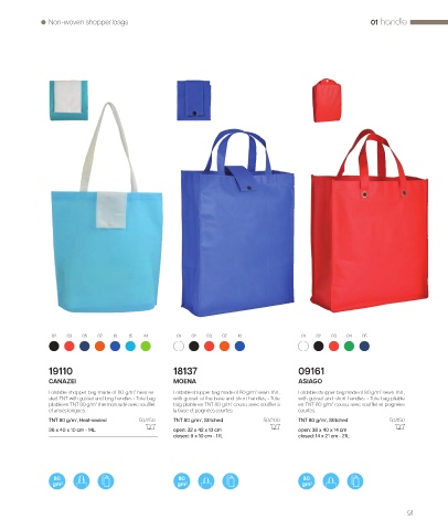 aled TNT with gusset and long handles. • Tote bag with gusset at the base and short handles. • Tote with gusset and short handles. • Tote bag pliable