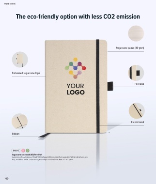 loop, and ribbon marker. Embossed sugarcane logo on the backside. Size: 21 × 14 × 1,3 cm
