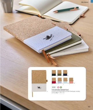 Office & Business YOUR LOGO 01 11 11 01 04 05 11 08 15 166 236 967381 Cork and cotton notebook Trevor 02 Cork and cotton notebook (approx. A5) with 80 lined pages. Including pen loop. Size: 21 × 14 × 1,2 cm 102 103