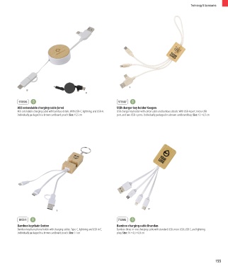 ABS extendable charging cable with bamboo details. With USB-C, lightning, and USB-A. USB charger key holder with cotton cable and bamboo details. With USB-A port, micro-USB