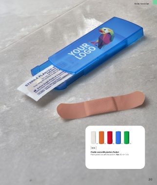 Kitchen, Home & Care 32 21 32 08 02 07 08 23 29 1020 Plastic case with plasters Pocket Plastic pocket case with five plasters. Size: 10 × 4 × 1 cm 212 213