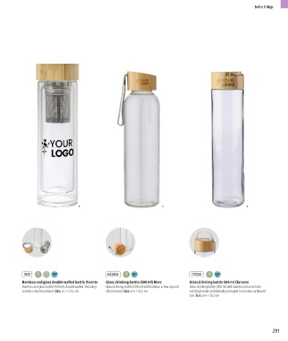 Bamboo and glass bottle (420 ml), double walled. Including Glass drinking bottle (500 ml) with bamboo screw cap and Glass drinking bottle (500 ml) with bamboo lid and metal