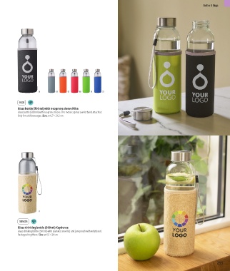 Glass drinking bottle (500 ml) with stainless steel lid, and jute pouch with wristband.