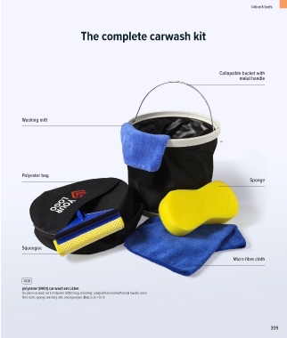 Six-piece car wash set in Polyester (600D) bag. Including: collapsible bucket with metal handle, micro