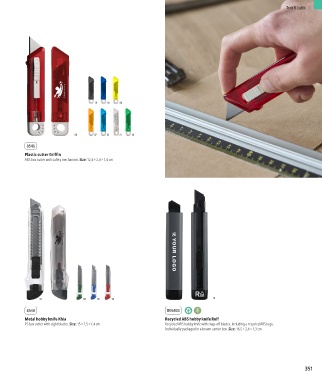 PS box cutter with eight blades. Size: 15 × 2,5 × 1,4 cm Recycled ABS hobby knife with snap-off blades, including a recycled ABS logo.