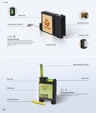 ABS tape measure (2 meter) with spirit level, memo pad, pen with