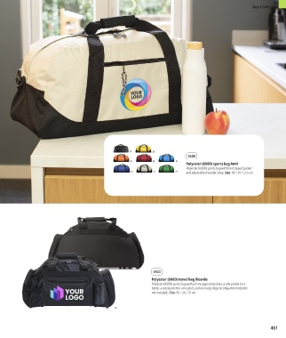 Polyester (600D) sports bag with a front zippered pocket, a side pocket for a