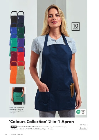 PR159 ‘Colours Collection’ 2-in-1 Apron One apron worn two ways, Bib and waist apron styles, PR150 ‘Colours Collection’ Bib Apron Adjustable buckle on neckband, 90cm self-fabric ties, Two sizes 85° Wash