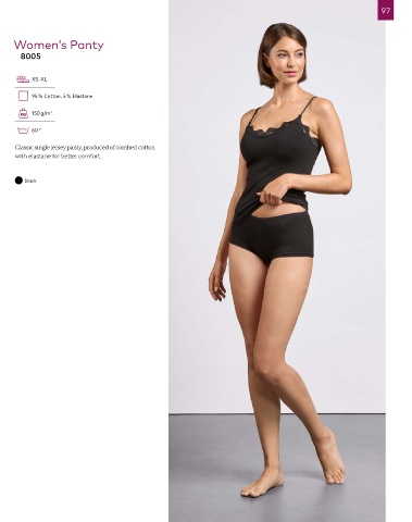 97 Women’s Panty 8005 XS–XL 95 % Cotton, 5 % Elastane 150 g/m 2 60 ° Classic single jersey panty, produced of combed cotton with elastane for better comfort. black