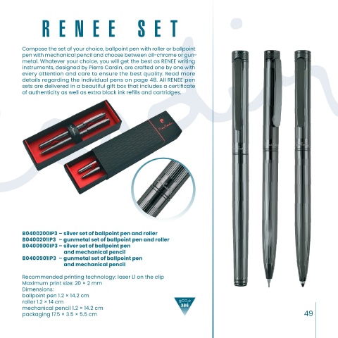 cartridge are included. The mechanical twist action pencil comes details regarding the individual pens on page 48. All RENEE pen