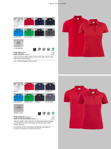Pique with stretch. Men’s style has 3 buttons and women’s style has