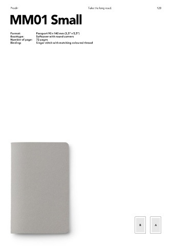 Prodir Take the long road. 128 MM01 Small Format: Passport 90 × 140 mm (3,5” × 5,5”) Booktype: Softcover with round corners Number of page: 72 pages Binding: Singer stitch with matching coloured thread B A