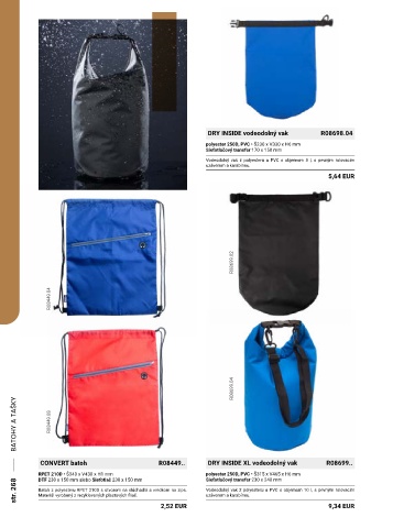 str. 268 Batoh z polyesteru RPET 210D s otvorom na slúchadlá a vreckom na zips. Vodeodolný vak z polyesteru a PVC s objemom 10 l, s pevným rolovacím