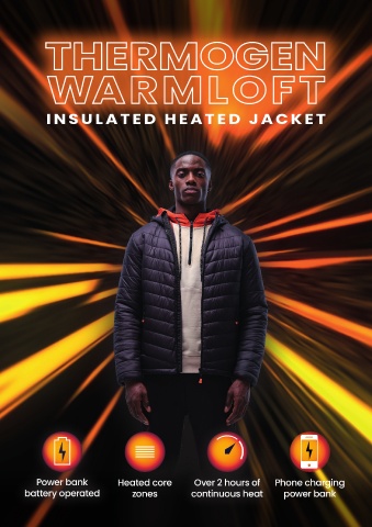 THERMOGEN WARMLOFT INSULATED HEATED JACKET Power bank Heated core Over 2 hours of Phone charging battery operated zones continuous heat power bank