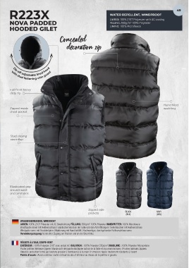 R223X AUßEN: 100% 210T Polyester mit AC Beschichtung FÜLLUNG: 550g/m² 100% Polyester INNENFUTTER: 100% Microfleece