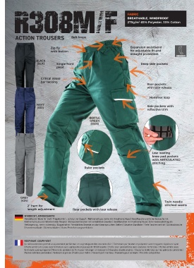 Poches latérales profondes | Pantalons à pinces | Poche pour mètre | Passant port marteau | Passants pour ceinture | Prix très competitive R308M: CASE: 20 PACK: 10 R308F: CASE: 10 PACK: 5