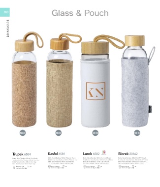 Bottle. Glass/ Bamboo. 500 ml. Cork Pouch. Bottle. Glass/ Bamboo. 500 ml. Polyester Pouch. Bottle. Glass/ Bamboo. 530 ml. Soft Shell Pouch. Bottle. Glass/ Bamboo. 500 ml. Felt RPET Pouch.