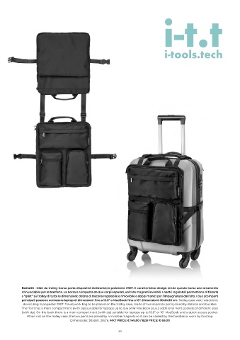 principali possono contenere laptop di dimensioni fino a 15.6” o MacBook fino a 16”. Dimensioni: 30x8x38 cm. Trolley case vest / electronic