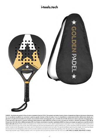 the low balance, the fiberglass surface which provides comfort and speed to the ball. Weight 355 g. Size: 46 x 26 x 3.8 cm. Balance: 275mm.