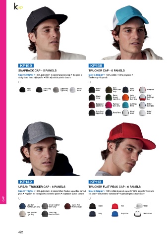 Size: U 170g/m • 100% polyester • 6 panels Urban Trucker cap with a curved Size: U 255g/m • 100% cotton 6 panels cap with 100% polyester mesh and