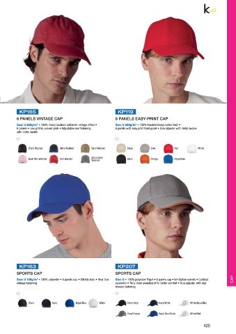 Size: U 140g/m • 100% polyester • 6 panels cap • Athletic look • Rear tear Size: U • 100% polyester Piqué • 6 panels cap • Ventilation eyelets • Contrast CAP