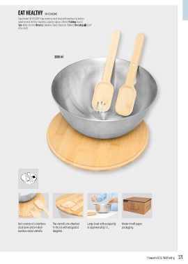 Set consists of a stainless The utensils are attached Large bowl with a capacity Modern kraft paper