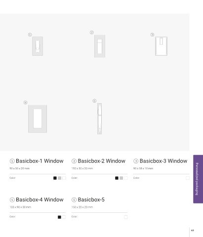 ② ① ③ ④ ⑤ ① Basicbox-1 Window ② Basicbox-2 Window ③ Basicbox-3 Window 90 x 50 x 20 mm 110 x 50 x 20 mm 90 x 58 x 10 mm Color: Color: Color: Personalized packaging ④ Basicbox-4 Window ⑤ Basicbox-5 133 x 90 x 30 mm 150 x 20 x 20 mm Color: Color: 63