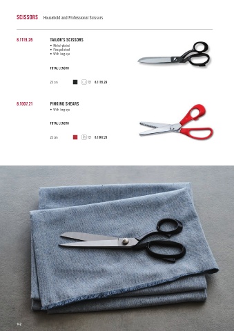 SCISSORS Household and Professional Scissors 8.1119.26 TAILOR’S SCISSORS • Nickel-plated • Fine polished • With long eye TOTAL LENGTH 26 cm 12 8.1119.26 8.1007.21 PINKING SHEARS • With long eye TOTAL LENGTH 21 cm 12 8.1007.21 142