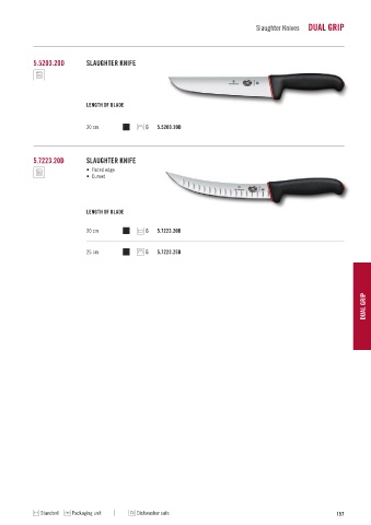 Slaughter Knives DUAL GRIP 5.5203.20D SLAUGHTER KNIFE LENGTH OF BLADE 20 cm 6 5.5203.20D 5.7223.20D SLAUGHTER KNIFE • Fluted edge • Curved LENGTH OF BLADE 20 cm 6 5.7223.20D 25 cm 6 5.7223.25D DUAL GRIP Standard Packaging unit Dishwasher safe 157