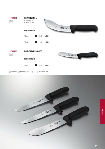 5.7803.12 SKINNING KNIFE • Widened tip • American type LENGTH OF BLADE 12 cm 6 5.7803.12 15 cm 6 5.7803.15 5.7903.12 LAMB SKINNING KNIFE LENGTH OF BLADE 12 cm 6 5.7903.12 Standard Packaging unit Dishwasher safe FIBROX 179