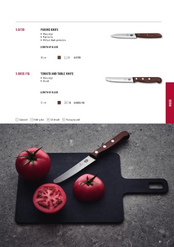 5.0730 PARING KNIFE • Wavy edge • Pointed tip • Without blade protection LENGTH OF BLADE 10 cm 6 5.0730 5.0830.11G TOMATO AND TABLE KNIFE • Wavy edge • Round LENGTH OF BLADE 11 cm 10 5.0830.11G WOOD Standard Folding box SB sheath Packaging unit 61